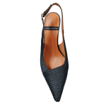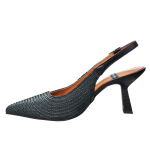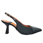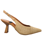 This pointed toe sling-back creates visual interest with a faux stacked heel and raffia finish while maintaining a soft neutral look.